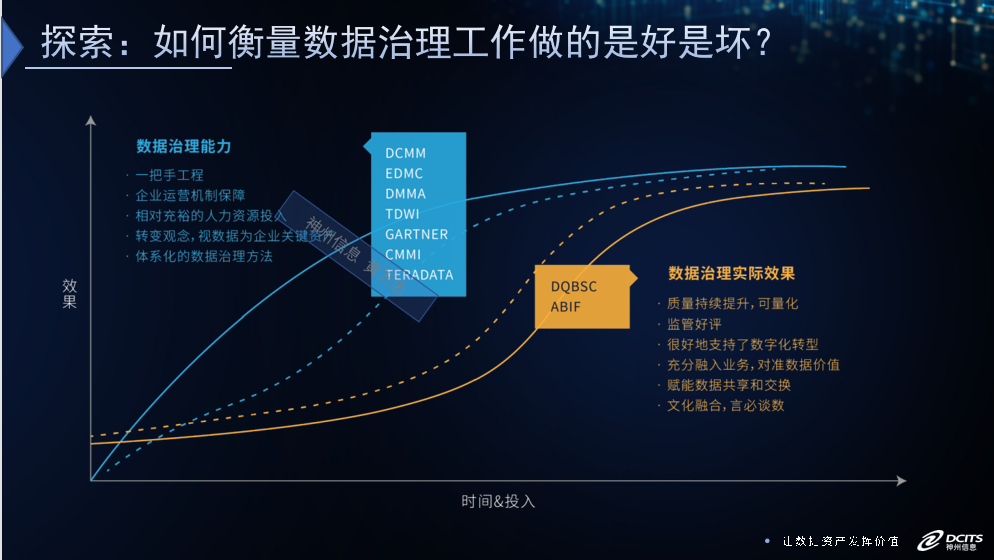 从能力和实际资产情况两个维度就可以很好地来评估数据治理的效果。像国标的DCMM数据管理成熟度评估是在衡量数据治理能力,而数据质量平衡记分卡则是在衡量数据质量的实际情况。两者合一,都可以较好地说清楚数据治理的效果。
